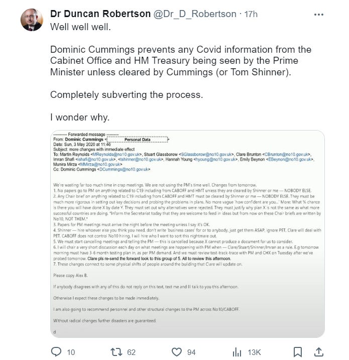 And for all that members of Independent SAGE want to spin it another way, this email from Cummings doesn’t read to me like a power grab for nefarious means: it looks to me like someone in a very senior role frustrated by subversions of the decision-making process and inefficiencies in the system, and coming up with a way to improve it. In other words, he was doing his job.