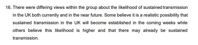 For example, there’s been a lot of discussion about whether the Prime Minister should have spent his February half term working on COVID: but the SPI-M-O statement of February 17th hardly indicates a consensus from the scientists themselves that there was great urgency at this stage (“a realistic possibility” is SAGE code for “just under a 50% chance”, they are talking about things starting to go wrong “in the coming weeks” not right now).