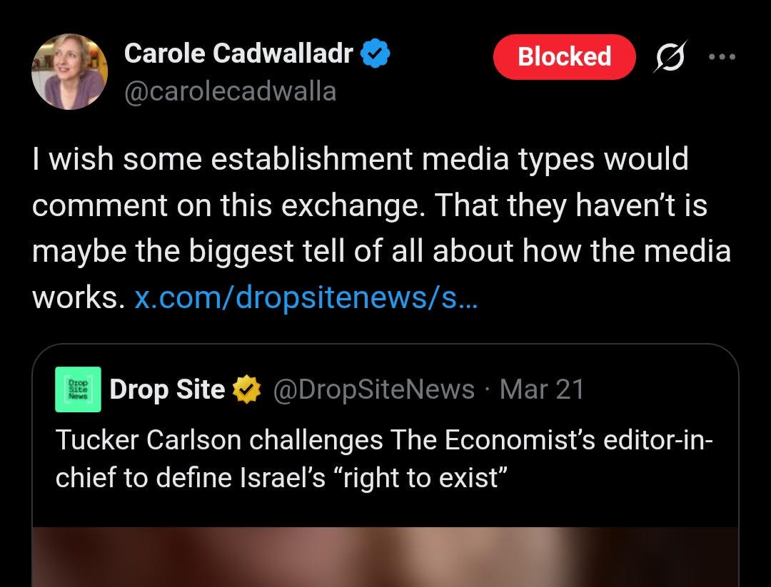 And there’s no better exemplar of descent into this kind of rabbit hole than Carole Cadwalladr, founder of Independent SAGE itself, and the author of at least one of those Observer pieces. It’s a pretty radical ten-year journey to speedrun from deciding that Russia was behind Brexit and Trump, to approvingly quoting Tucker Carlson (not exactly an anti Russia voice):