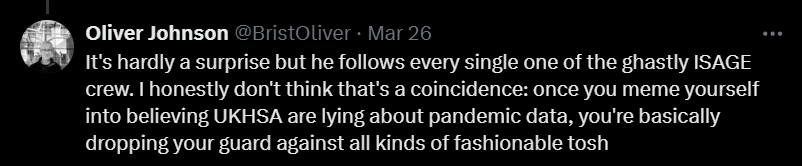 And somewhere close to these kinds of theories, you could usually find an FBPE hashtag in a bio, and a supporter of Independent SAGE nudging and winking. I genuinely don’t think it’s a coincidence that Dr Pankhania follows nearly all the members of that group on Twitter: