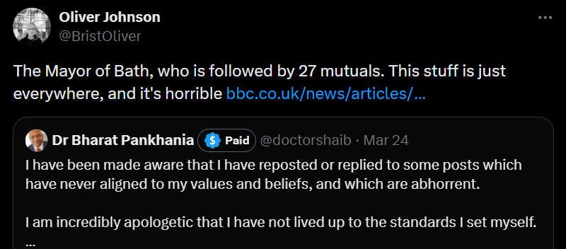 Perhaps as a reader of Dave Rich’s Substack, I shouldn’t be surprised to see this kind of casual dinner party antisemitism being quite so ubiquitous. But it’s still a shock to realise that you are two hops on the network away from someone who is (even in the best case) blindly oblivious to these kinds of tropes. And it’s disturbing that an educated man like Dr Pankhania can end up in a place where he feels comfortable trotting out stuff that would get rapidly you barred from polite society if you said it about other groups.